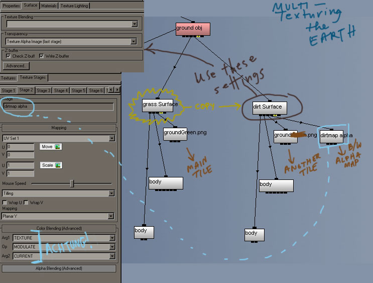 - Object View: inside the ground Object will be two Surfaces. Leave the one with the main tile alone. For the alphamapped Surface add a 2nd Texture Stage under “Mapping” choose “UV Set 1” there will be a pop-up... Let it generate a new UV map with Planar Y mapping. Then use the settings in the screenshot. It should work.