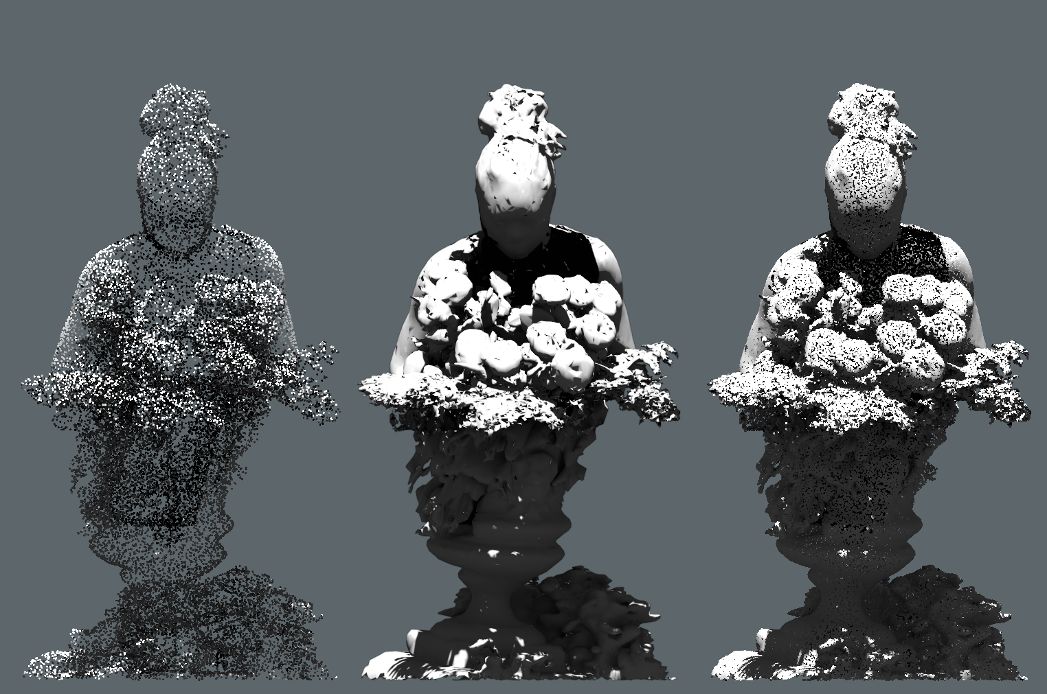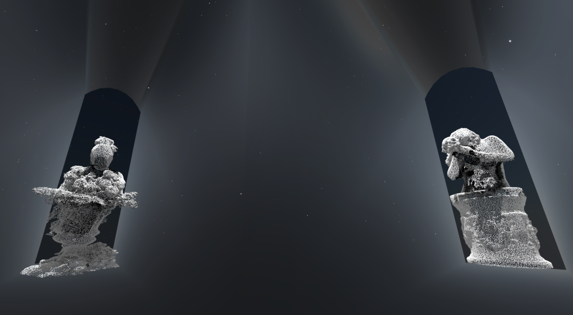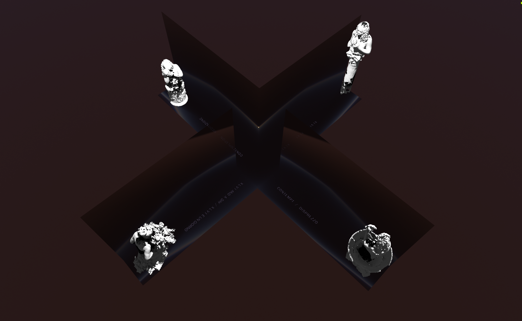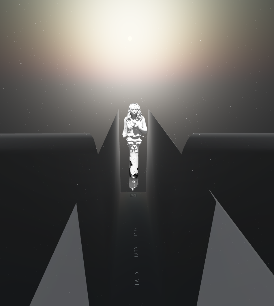 when i was 46 it was the year after a deep depression. the year before I had learned about choosing. when i turned 46 i learned what it was to have chosen. I would go to a park and recite epic poetry to now one. X.L.V.I. was the year I read Dante, in The Vita Nova, he writes about reconstructing his life around love. about meeting his Beatirice, and her death, and about creation. On my 46th birthday I forgave myself. I made two 3d scans to mark the occasion. Now why do i bring this back, now when I am 49? I feel I have completed the cycle that began then. when i look back at the timeline, i see a clear line that began right then, with my choosing a new life, a life that i am living right now. At 46, choosing to write incipit vita nova in ink at the top of a new sketchbook.The decision to make two scans of myself, celebrating alone on my birthday, holding a single white rose and a day later offering myself the entire bouquet. In this particular realtime rendering of these scans I place those 2 scans in a crossroads of ethereal hallways. Also present are two other scans made as a basis for a project about Mary Magdalene… these have nothing to do with the main narrative here or choosing or my turning 46. but, they do show danger, crossing and covering my choice like a death card in tarot. In these dark hallways you hear me reciting Dante from vita nova and the opening lines of inferno. i hope my italian accent isn’t too offensive. there are also a few lines from the sketchbook of that year. the closer you get to any of the statues the more they dissolve away. take from that what you will.